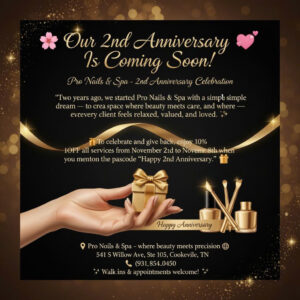 At Pro Nails & Spa, we believe that true beauty lies in the details. Nestled in Cookeville, Tennessee, our salon offers a calm and inviting space where you can take a break from the day and enjoy quality nail and spa services designed with care.